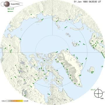 video: The magnetic field from ground based magnetometers in the auroral region superposed over space-based images of the aurora.