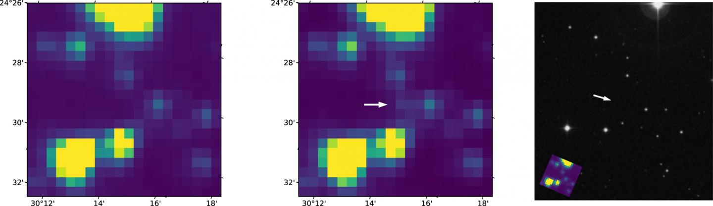 image: TESS full-frame image in the cadence just before the BAT trigger (left) and at the peak flux of the burst (center). The emergence of the afterglow is apparent in the center of the image, indicated by the white arrow. The right panel shows the same region of the sky, with a slightly different orientation, in the Digitized Sky Survey (DSS); a small inset of TESS image is provided in the bottom left corner to demonstrate the change in orientation.