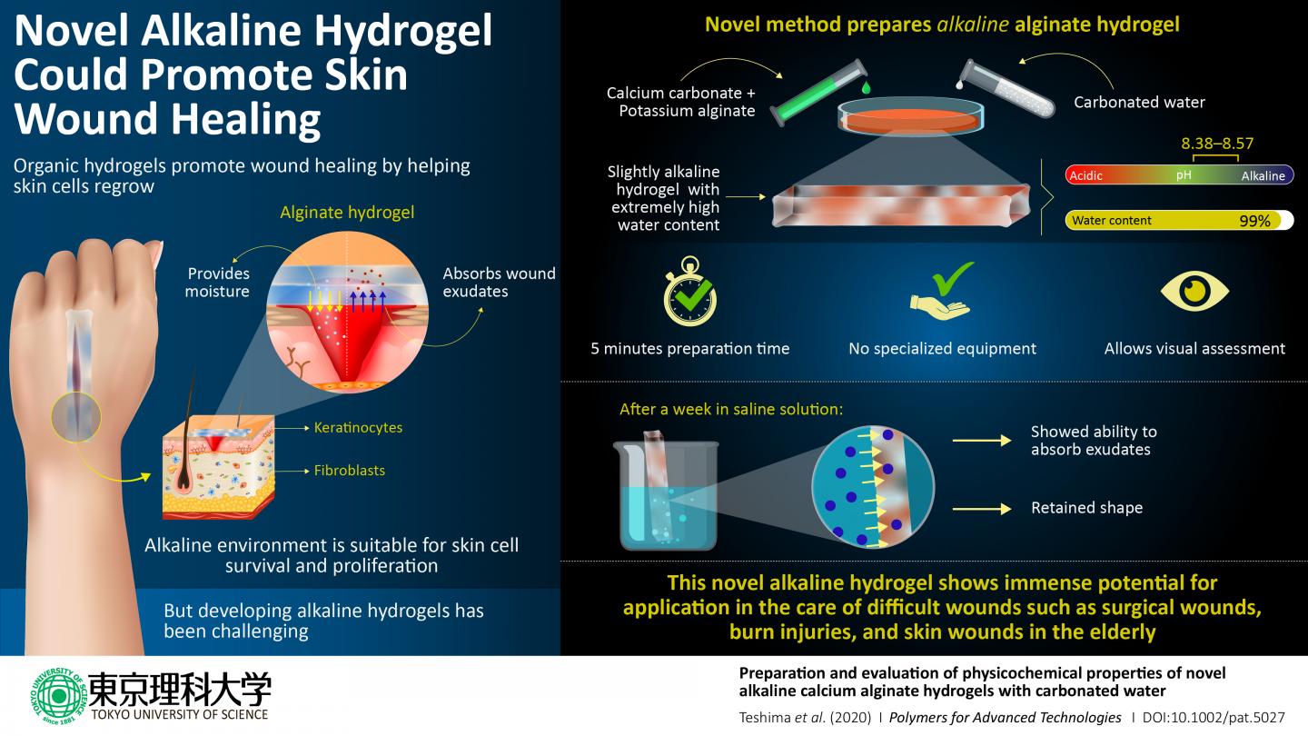 Their method involves mixing calcium carbonate and potassium alginate, and then adding carbonated water to this mixture and letting the "gelation" (gel formation) process take place. In this method, the pH of the gel shifts to alkaline because the carbon dioxide volatilizes after gelation. This also ensures transparency of the gel, which in turn allows the visual assessment of wounds and helps in easily ascertaining the progress of healing. Also, regardless of the amounts of ingredients used, the resultant hydrogels have extremely high water content--up to 99%.