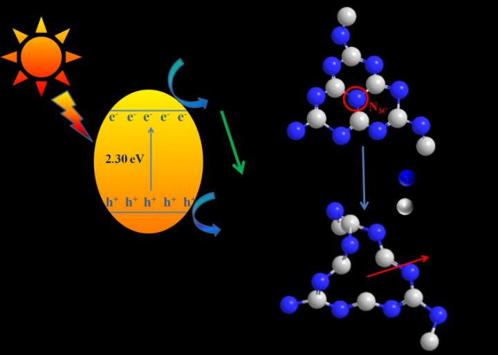 image: A schematic illustration of modified g-C3N4 by nitrogen vacancies and reaction mechanism. The nitrogen vacancies not only increased the specific surface area, exposed more active sites, but also inhibited the recombination of photogenerated carriers on the surface of photocatalysts, resulting in the enhancement of photocatalytic and electrocatalytic performances.
