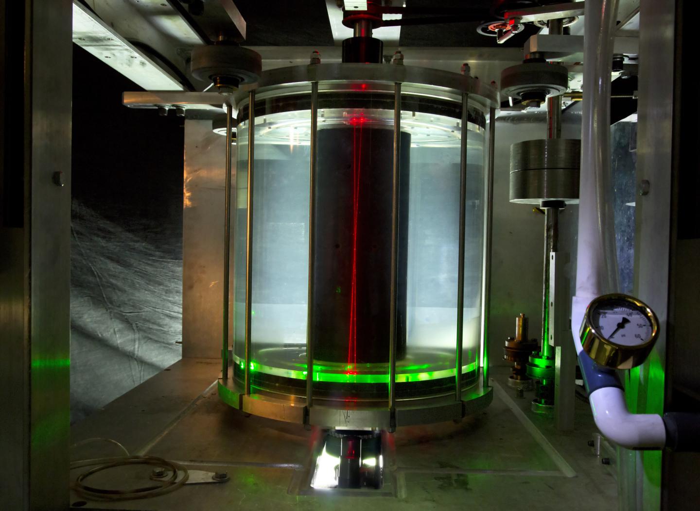 image: This is a water-filled version of MRI experiment showing transparent outer cylinder and blackened inner cylinder. Red lasers enter at bottom to measure the local speed of the water.