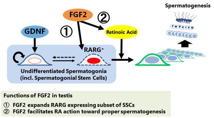 A research team found a novel function of fibroblast growth factor 2 (FGF2), a self-renewal factor for spermatogonial stem cell (SSC) which is the origin of the sperm production. Although it has demonstrated that both FGF2 and glial cell line-derived neurotrophic factor (GDNF) is indispensable for SSC self-renewal and survival in vitro, the present study revealed that FGF2 showed the different properties from GDNF in mouse testis. This finding will contribute to the regulation of SSCs in vivo for the treatment of male infertility.