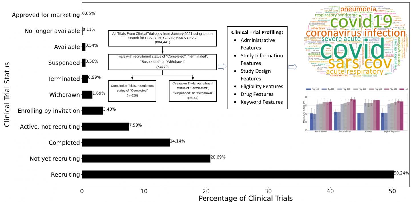 For the study, Zhu and Elkin collected 4,441 COVID-19 trials from ClinicalTrials.gov to build a testbed. They designed four types of features (statistics features, keyword features, drug features and embedding features) to characterize clinical trial administration, eligibility, study information, criteria, drug types, study keywords, as well as embedding features commonly used in state-of-the-art machine learning. In total, 693 dimensional features were created to represent each clinical trial. For comparison purposes, researchers used four models: Neural Network; Random Forest; XGBoost; and Logistic Regression.