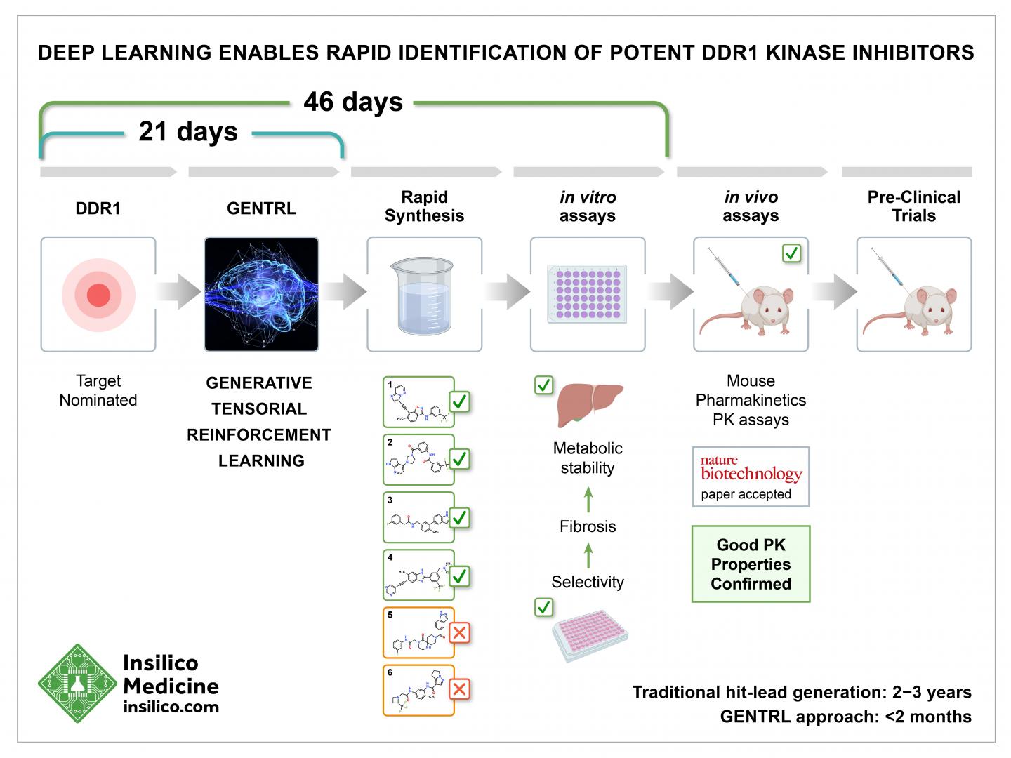 September 2nd, 2019, 4 PM, London, Insilico Medicine, a global leader in artificial intelligence for drug discovery, today announced the publication of a paper titled, "Deep learning enables rapid identification of potent DDR1 kinase inhibitors," in Nature Biotechnology. The paper describes a timed challenge, where the new artificial intelligence system called Generative Tensorial Reinforcement Learning (GENTRL) designed six novel inhibitors of DDR1, a kinase target implicated in fibrosis and other diseases, in 21 days. Four compounds were active in biochemical assays, and two were validated in cell-based assays. One lead candidate was tested and demonstrated favorable pharmacokinetics in mice.
