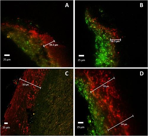 image: The effects of microbial volatile organic compound exposure on the viability of sclerotia of Sclerotinia sclerotiorum were evaluated in a microscopy-based approach. Green indicates intact hyphae; and red indicates damaged hyphae. A and B, Untreated sclerotia; C, Sclerotia treated with Pseudomonas helmanticensis Sc-B94; and D, Sclerotia treated with Buttiauxella