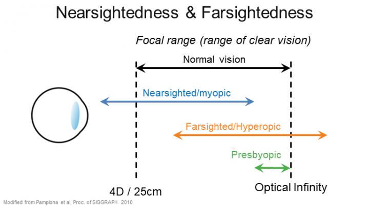 image: Shown: Range of focus for various eye refractive conditions. Myopia shifts the focal range closer, causing bad far sight. Hyperopia shifts the focal range farther (allowing focusing ability beyond infinity), causing bad near sight and lens fatigue since the crystalline lens does not relax even when looking at infinity. Presbyopia reduces the focal range and moves the nearest plane of focus away from the eye.