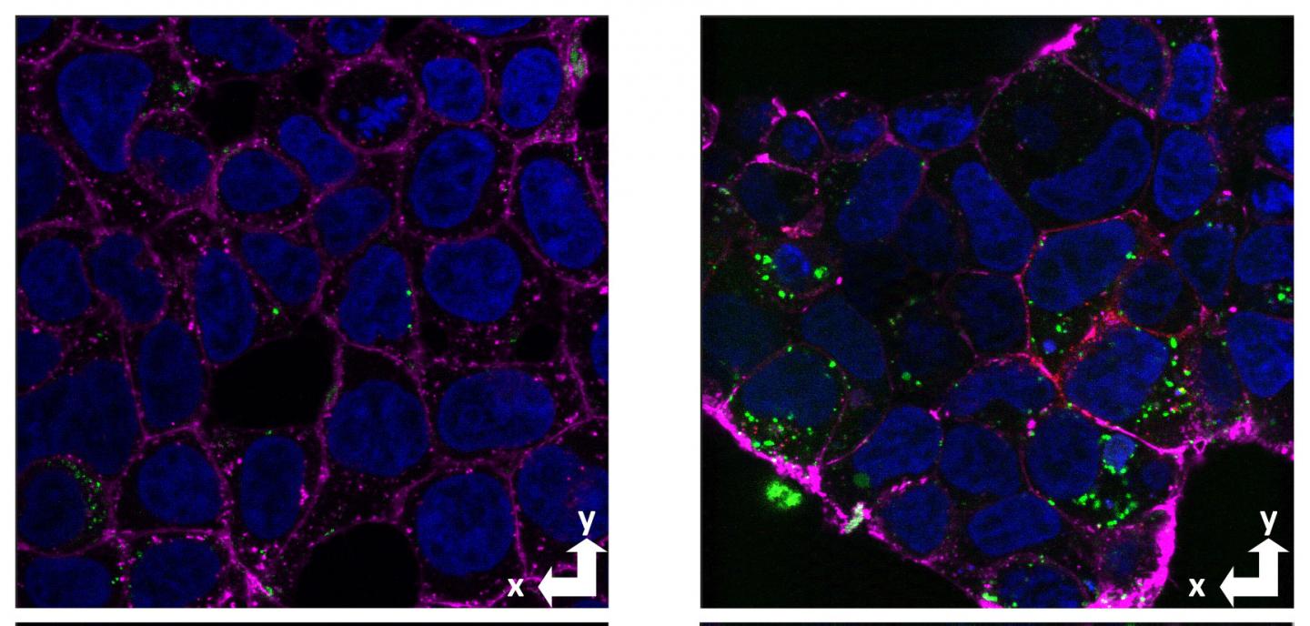 image: Confocal images of cells with and without the cellular prion protein (labeled red), showing uptake of amyloid beta (labeled green) in cells with the prion protein (above) and no uptake in cells lacking the prion protein (below). (Magenta is membrane dye and blue is nuclear dye.)