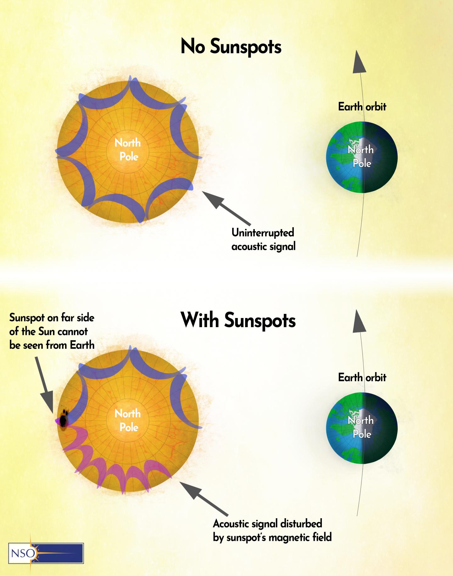 "We measured a change in acoustic signals on the far-side of the Sun", explains Dr. Alexei Pevtsov, Associate Director for NSO's Integrated Synoptic Program, the program responsible for the prediction. "We can use this technique to identify what is happening on the side of the Sun that faces away from Earth days before we can catch a glimpse from here. Having up to five days lead time on the presence of active sun spots is extremely valuable to our technology-heavy society."