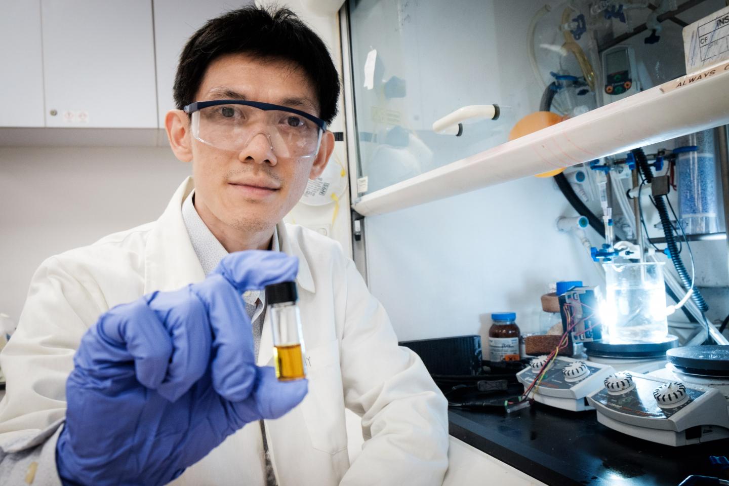 image: NTU SPMS Asst Prof Soo Han Sen with the plastic-photocatalyst mixture, which when exposed to sunlight converts the plastic to formic acid, a useful chemical.