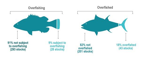image: Of 321 stocks with known status, 293 (91%) are not subject to overfishing. Of 244 stocks with known status, 201 (or 82%) are not overfished, leaving 43 stocks (18%) listed as overfished. (NOAA)