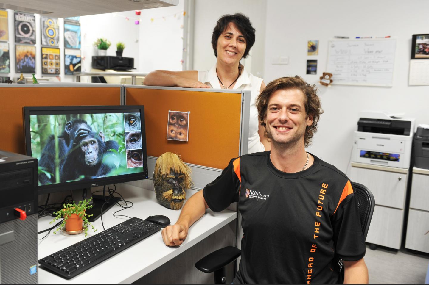image: Doctoral student Mr Juan O. Perea-García (front) and Associate Professor Antónia Monteiro (back) from the Department of Biological Sciences at NUS suggest that apes may follow each other's gaze like humans.