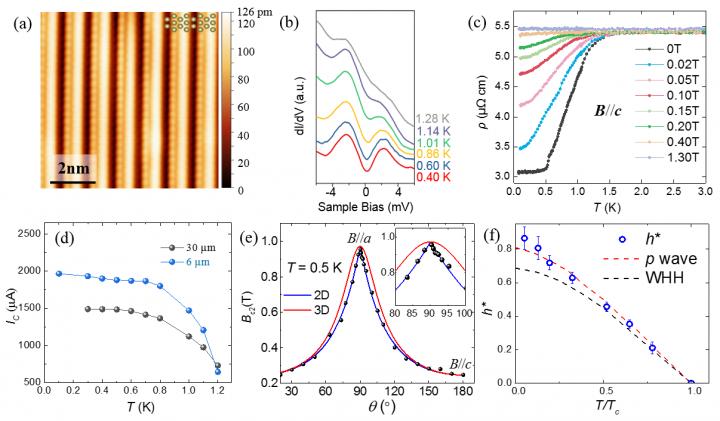 image: (a) STM images of the fresh cleaved surface of TaIrTe4. (b) Temperature dependence of dI/dV spectra from 0.4 K to 1.28 K. (c) ρ(T) curves at different perpendicular magnetic fields (B//c axis) from 0 T to 1.30 T. At 0 T, the sample resistivity begins to drop at 1.54 K (superconducting transition temperature Tc). (d) Temperature dependence of critical current Ic of two TaIrTe4 samples with two different thicknesses (30 μm, 6 μm). These samples were obtained by mechanical exfoliation from one sample. (e) Angular dependence of the upper critical field Bc2 at 0.5 K. (f) Normalized upper critical field h? as a function of normalized temperature T/Tc. The red dashed line indicates the expectation for a polar p-wave state. The black dashed line indicates the Werthamer-Helfand-Hohenberg theory for s-wave superconductor.