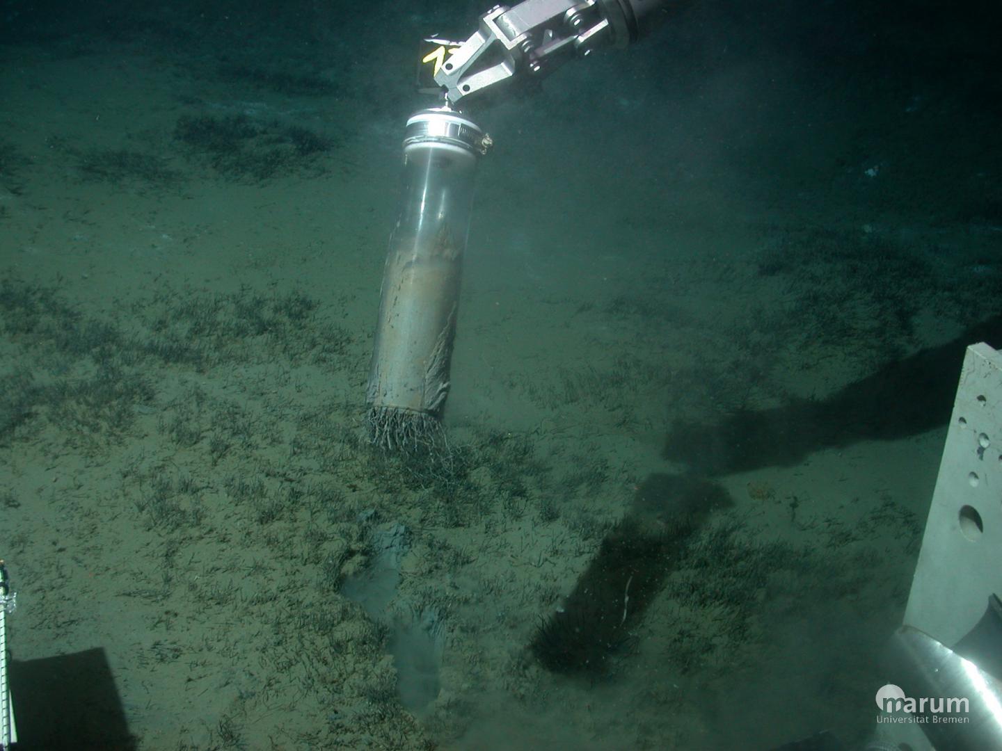 image: The submersible takes samples in the mud around Håkon Mosby mud volcano. With this tube so-called sediment cores can be taken, which allow an insight into the community of organisms on the surface and deeper in the sediment.