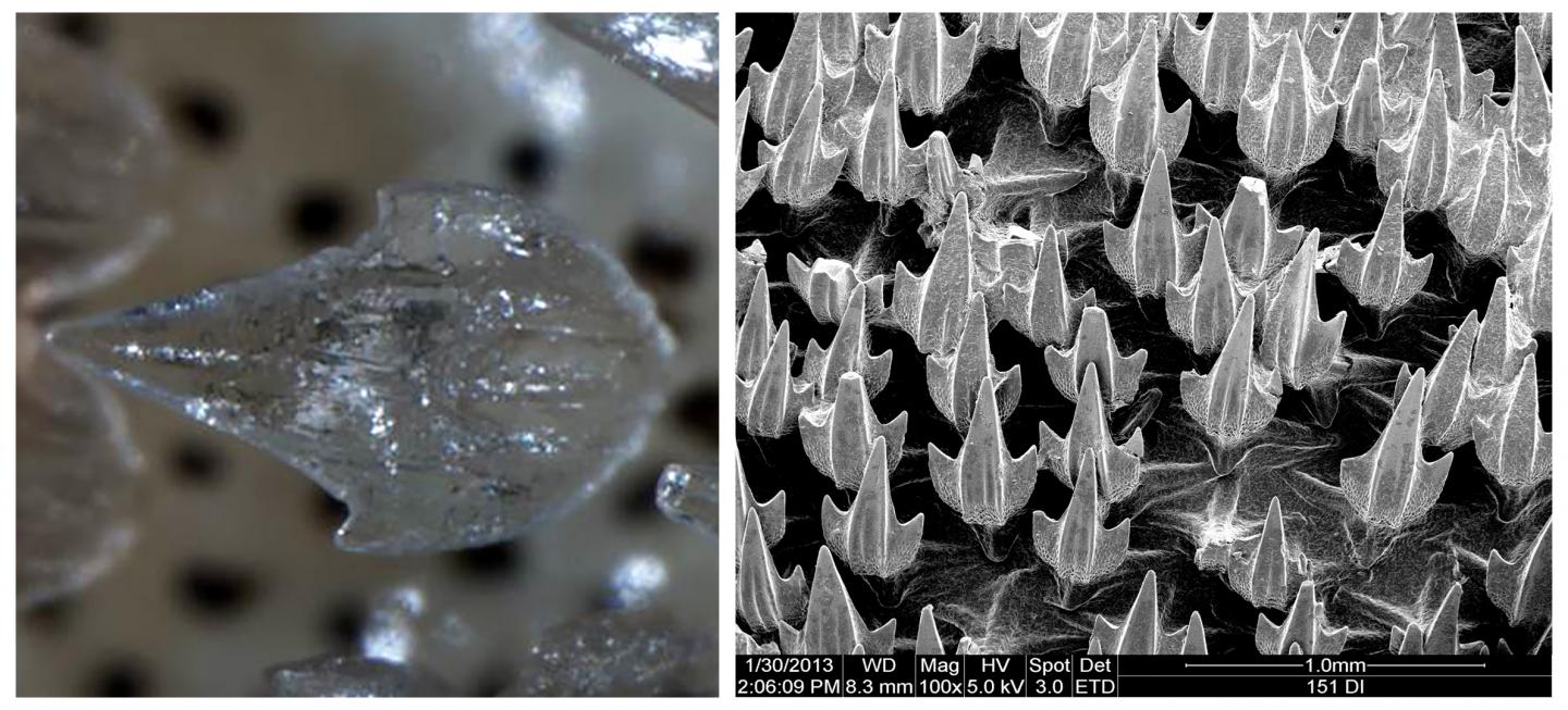 image:Â Denticles -- the modified scales -- of a puffadder shyshark seen through an optical microscope (left) and a scanning electron microscope (right) of CO2 exposed sharks denticles.