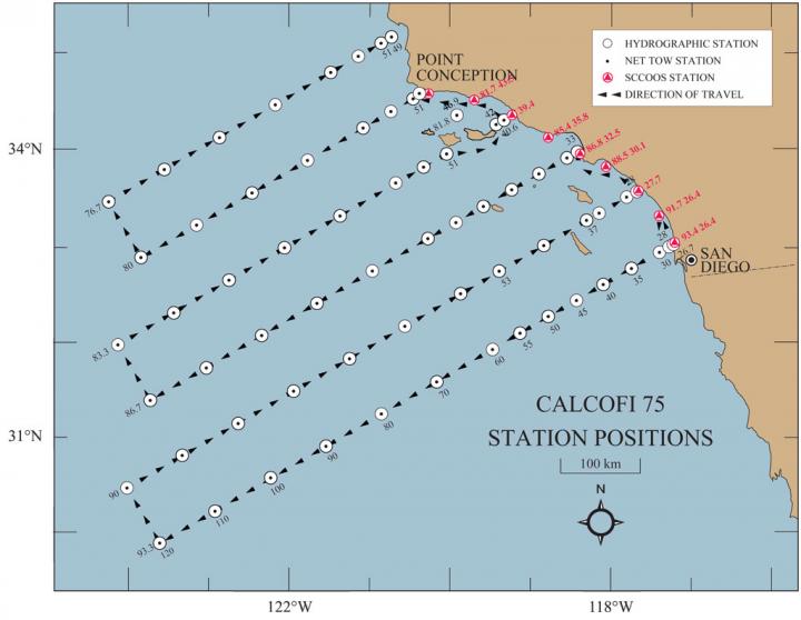 image: The 75-station pattern is typical for summer and fall cruises by CalCOFI, which has collected data on marine life and ocean conditions off the California coast. The original 1950s sampling plan was similar but covered a larger area, from the northern tip of California to the southern tip of the Baja peninsula.