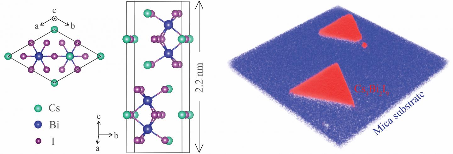 image: At left, top and side views of the crystal structures of perovskite-derived Cs3Bi2I9, a material synthesized at Rice University that shows valleytronics capabilities. Each unit cell contains two neighboring layers with a weak van der Waals interaction in between. At right: an image shows triangles of the material on a mica substrate.