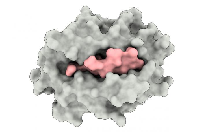 image: An illustration shows a major histocompatibility (grey) protein encompassing a peptide drawn from a SARS-CoV virus (pink). The complex helps trigger the activation of T cells that are part of the immune system. Rice University researchers discovered a non-anchor binding residue in the peptide that could both contribute to binding and to the T-cell activation needed to defeat the virus.
