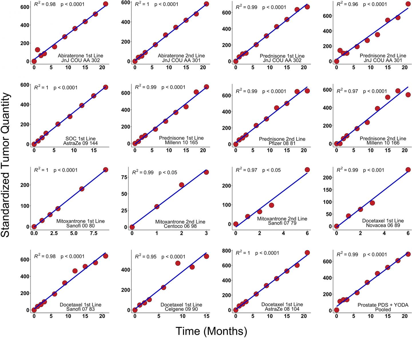 image: Results in clinical trials. PSA values from fifteen arms derived from prostate cancer clinical trials were analyzed using scaling analysis and averaging all patients in a treatment arm. The straight line indicates that tumor growth is exponential. These trials were summed in the lower right-hand corner (Methods). We analyzed de-identified, patient-level comparator (control) arm data from thirteen randomized metastatic castrate-resistant prostate cancer (mRPC) clinical trials including one phase IIB and ten phase III available in Project Data Sphere, LLC (PDS) and two randomized trials available from YODA (Yale University Open Data Access). Thirteen arms were the comparators and two treatment arms were abiraterone. All y-axes have the units of inverse rate, i.e., time.