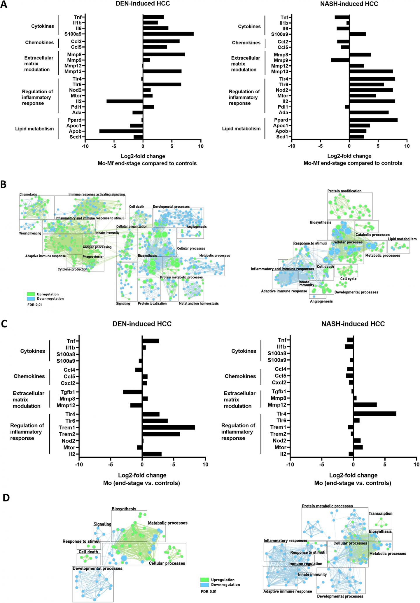 image: (A, C) Differential gene expression in Mo-M/Users/anxiolydiot/Desktop/press-formatting-html.html (A) and Mo (C) comparing end-stage and controls in DEN- (n = 4) and NASH-induced HCC (n = 4). (B, D) Gene enrichment mapping of significantly (FDR 0.01) up- or downregulated (green and blue, respectively) GO pathways comparing Mo-M/Users/anxiolydiot/Desktop/press-formatting-html.html (B) and Mo (D) in end-stage and controls in DEN- (n = 4) and NASH-induced HCC (n = 4).