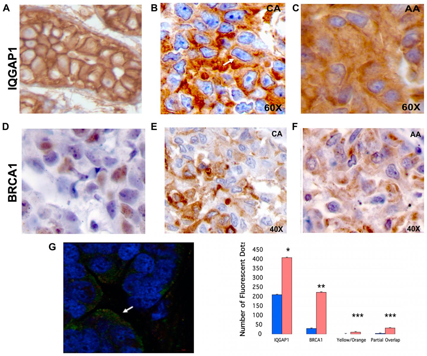 image: Mislocalization of IQGAP1-BRCA1 in human TNBC tumors phenocopies the dominant mutants and the TNBC cells. (A) Normal mammary tissue: chromogen IHC reveals IQGAP1 membranous localization. (B) Representative of five individual TNBC primary tumor tissue from Caucasian (CA) patients: chromogen IHC reveals IQGAP1 in the nuclear envelop (arrow) and in cytosolic aggregates. (C) Representative of five different TNBC primary tumor tissue from African American (AA) patients: IQGAP1 staining is mainly cytosolic and in aggregates. (D) Representative normal mammary tissue: BRCA1 staining is faint and both nuclear and cytosolic. (E) Representative of five TNBC primary CA tumor tissue: BRCA1 staining in cytosolic aggregates. (F) Representative of five TNBC primary AA tumor tissue: BRCA1 in cytosolic aggregates. (G) Quantitative super-resolution analyses of cytosolic IQGAP1 and BRCA1 in TNBC tumors: triple staining of IQGAP1, BRCA1 and the nuclei visualized by super-resolution microscopy (left). IQGAP1 (green) and BRCA1 (red) reside in invasive front (arrow). Quantification of IQGAP1 and BRCA1 in cytosol (orange bars) and in nuclei (blue bars) of TNBC patient tumors (right). Distinct pools of IQGAP1 and BRCA1 are found individually, co-localized (yellow/orange) or partially overlapping (partial overlap). Error bars are the Means± s. d for n = 3, p-value * 0.05, ** 0.01, *** 0.001.