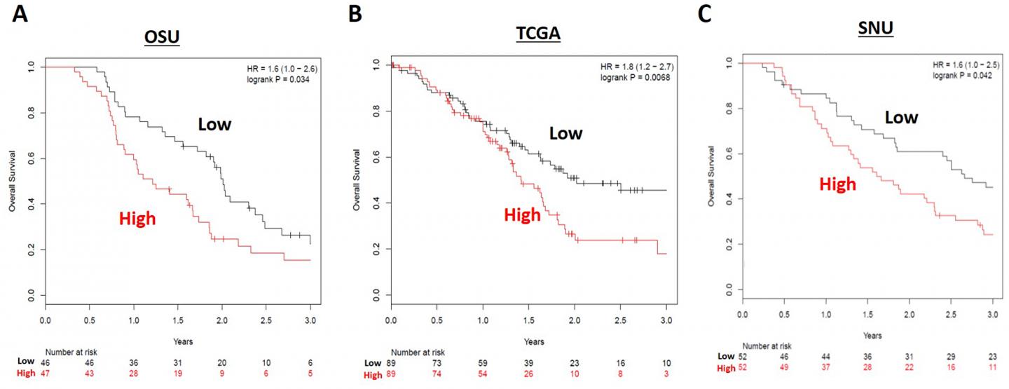 image: Overall survival (OS) for high (red) versus low (black) risk groups in the (A) OSU, (B) TCGA, and (C) SNU resected cohorts. Patients in the low risk miRNA grouping had longer OS in all three resected patient cohorts.