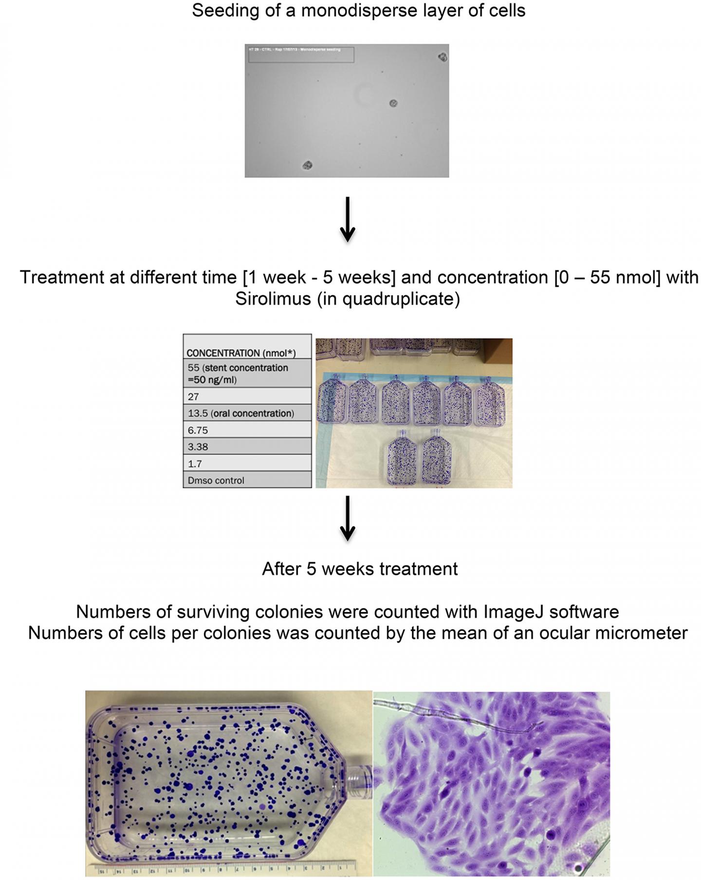image:Â Experiment design for clonal assay in T75 flasks in cell lines treated with sirolimus at different time and concentration. Experiments parameters used were: - synchronized colonies, no use of CO2, fructose based media, - antibiotics free (streptomycin/penicillin) - long term exposition to sirolimus (5 weeks) - cells are grown for 1 months before any treatment - doubling time was constant for cell lines so growth of cells is predictable - monodisperse of cells