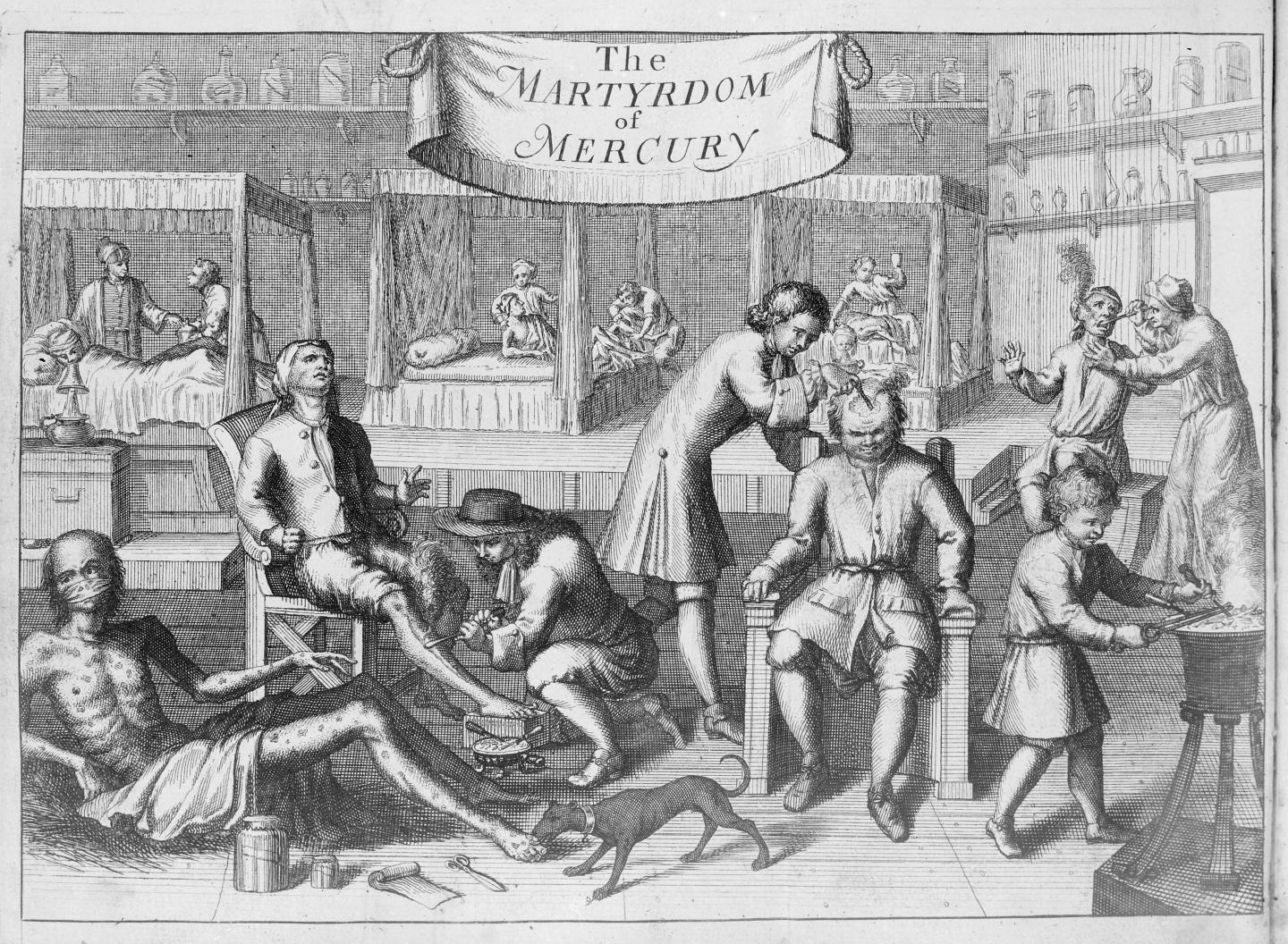 image: 'The Martyrdom of Mercury' (1709). Depicts patients being treated for syphilis in an 18th-century hospital.