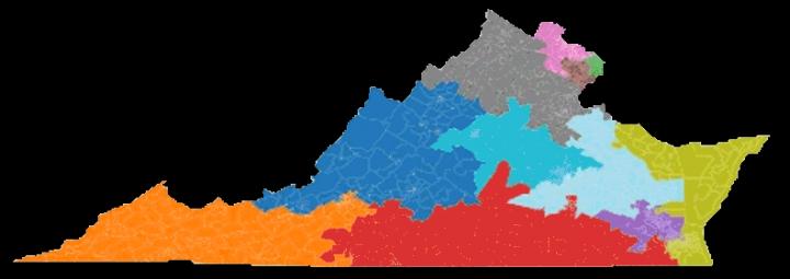image: Visualization of sampled county-preserving Virginia Congressional voting districts, created with the ReCom method in Gerrychain.
