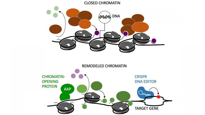 image: DNA is obscured by closed chromatin, an innately protective structure made up of proteins that interact with each other and with DNA. New activation associated proteins (AAPs) can be custom-built to bind near and open up chromatin so that DNA is made more accessible to gene-editing molecules like CRISPR.