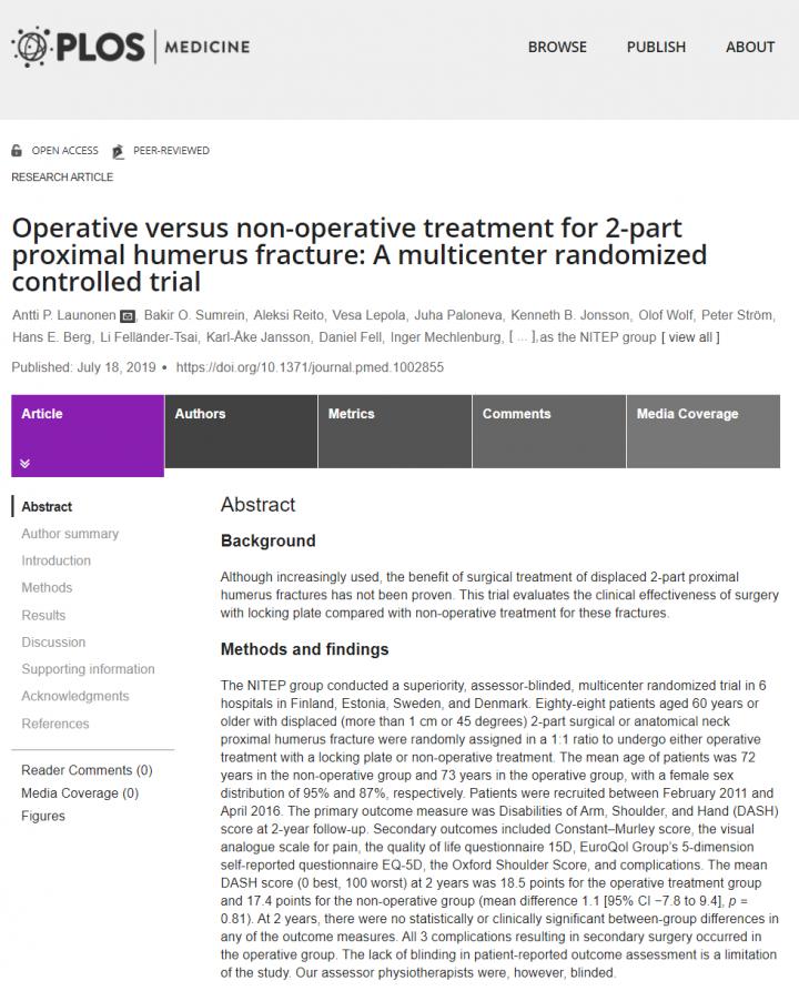 In the study, published in Plos Medicine journal, only fractures with a significant displacement between bone fragments were included. Traditionally, humerus fractures have been operatively treated using a metal plate and screws. In the non-operative treatment group, patients used a collar and cuff sling for three weeks and underwent instructed physiotherapy.