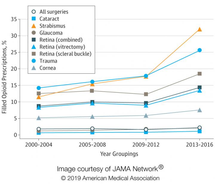 (PHILADELPHIA) - From 2000 to 2014, rates of filled opioid prescriptions after eye surgery rose considerably, despite reduced invasiveness of these procedures, according to a new study by researchers in the Perelman School of Medicine at the University of Pennsylvania. The results are published today in JAMA Ophthalmology.