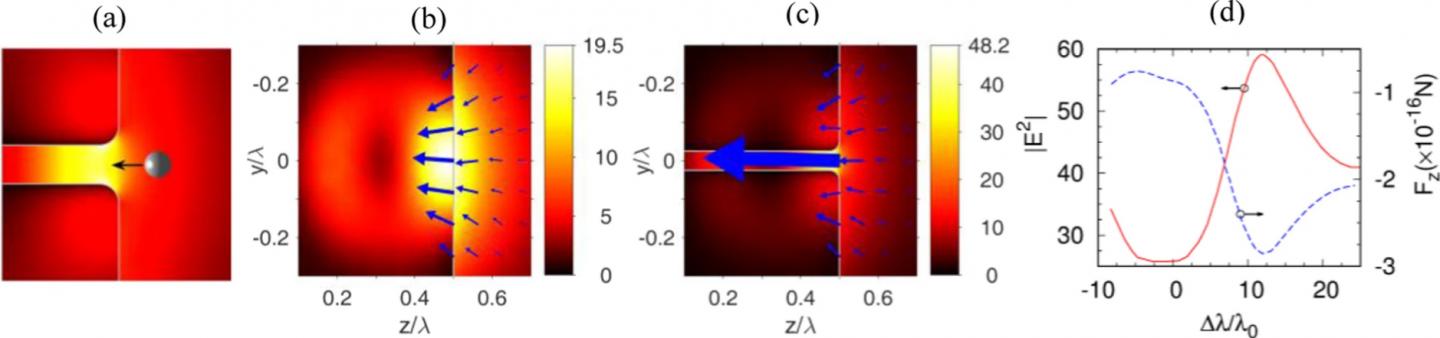 image: (a) Schematic diagram for the "optical vacuum cleaner", where a nanoparticle is pulled by the optical force, and moves towards the nanohole structured dielectric cuboid. (b,c) Light intensity (|E|2) and optical force distributions for (b) solid cuboid without a hole, (c) cuboid with a 20?nm hole. The refractive index and size of the simulated cuboids are set to be n?=?2 and L?=?λ. (d) Optical force and light intensity vs illumination wavelength, at the opening of the nanohole. The optical force is assumed to be exerted on a gold nanosphere with the radius of d?=?15?nm and complex dielectric permittivity εp?=??9.421?+?1.504 i at λ?=?600?nm35, and calculated using the dipole approximation. The arrows in blue color represent the optical gradient force.