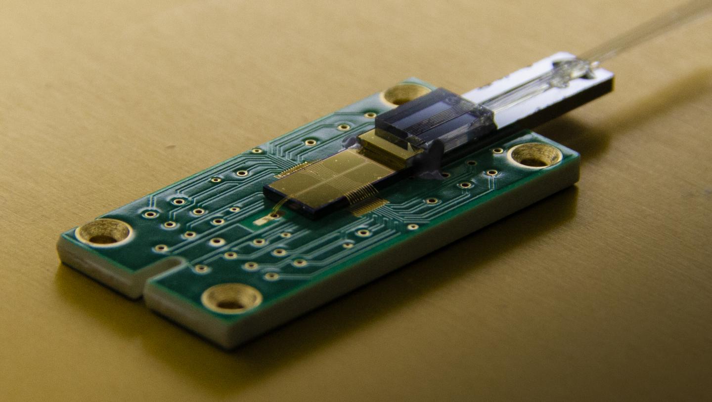 image: The ion-trap chip with integrated waveguides. The laser light is fed into the chip via the optical fibres on the right.