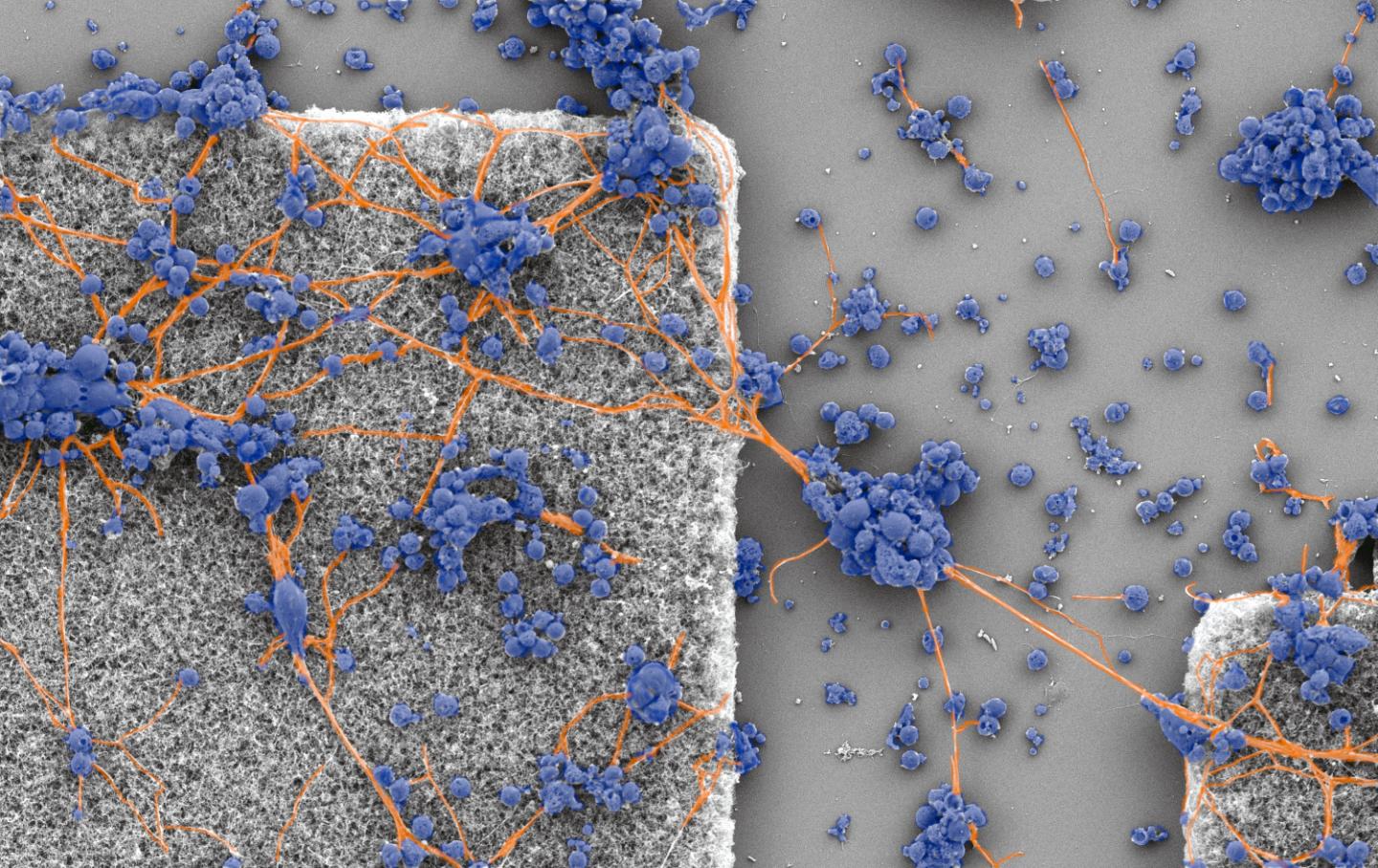 image: Neurons and dendrites form a fractal network on top of a large electrode in the left side of the image. University of Oregon physicist Richard Taylor is leading a project to develop tiny fractal inspired electrons that will efficiently connect with neurons to restore vision loss in people with retinal diseases. Taylor's student Willem Griffiths used false colors to highlight the activity on the electrode.