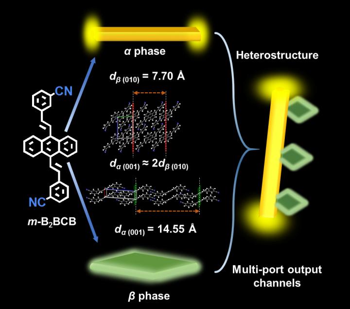 image: The morphologies of 1D organic microrod (α phase), 2D microplate (β phase) and organic heterostructure (OHSs), the chemical structures of m-B2BCB, The molecular packing arrangement of ab plane of α phase and the packing arrangement of ac plane of β phase.