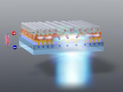They also designed a device structure with a grid of insulating material on top of one of the electrodes used to inject electricity into the organic thin films. Such grids--called distributed feedback structures--are known to produce the optical effects required for lasing, but the researchers took it one step further.