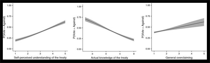 image: Logistic regression slopes and 95% confidence intervals of anti-establishment voting as function of self-perceived understanding of the treaty, actual knowledge of the treaty, and general overclaiming.