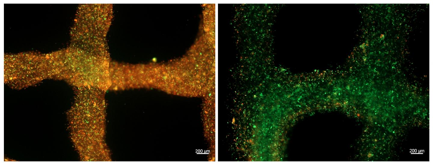 image: Heart cells in a bioink (left) without oxygen support and (right) with oxygen-releasing capabilities. Live cells are stained green, dead cells in red.