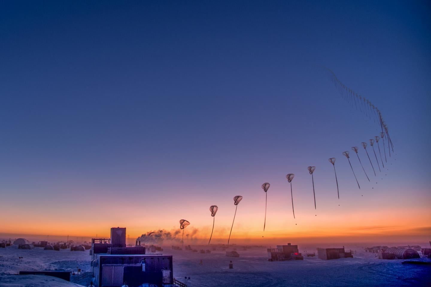 image: This time-lapse photo from Sept. 10, 2018, shows the flight path of an ozonesonde as it rises into the atmosphere over the South Pole from the Amundsen-Scott South Pole Station. Scientists release these balloon-borne sensors to measure the thickness of the protective ozone layer high up in the atmosphere.
