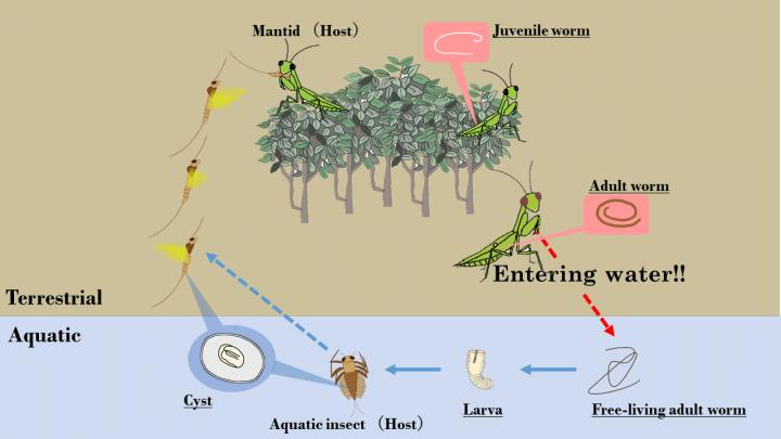 image: After hatching in the water, hairworm larvae parasitize aquatic insects and form a cyst in the hosts' body cavity. After the aquatic insect has grown wings, the hairworm is transported from an aquatic environment to a terrestrial environment. If the aquatic insect is consumed by a mantid, the hairworm grows inside the mantid's body until it reaches maturity and causes its host to enter the water. Once the mantid is in the water, the hairworm escapes back into the aquatic environment to reproduce, and its lifecycle ends.