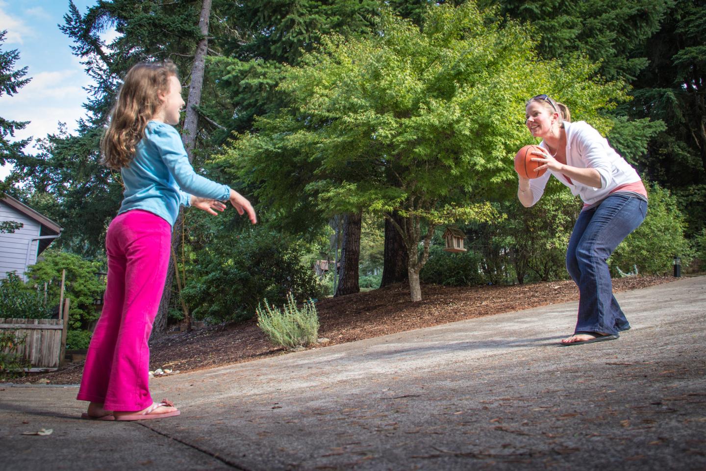 image: Researcher Megan MacDonald practices throwing a ball with a child.