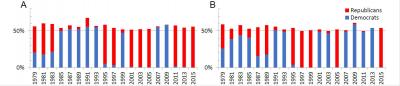 image: "The partisanship of the largest coalition in the (A) US House of representatives and (B) US Senate, from the session starting in 1979 to the session starting in 2015. Until the late 1990s, bipartisan coalitions were common, but during the 21st century coalitions have been almost entirely partisan."