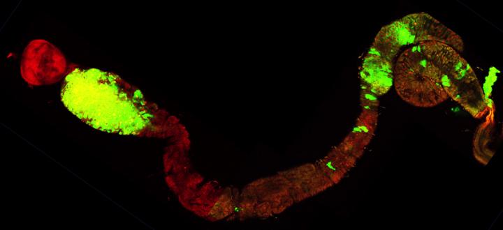 image: Tumor cells, expressing green fluorescent protein, in digestive tract of the fruit fly Drosophila melanogaster. A dense tumor (left) is visible in the anterior midgut.