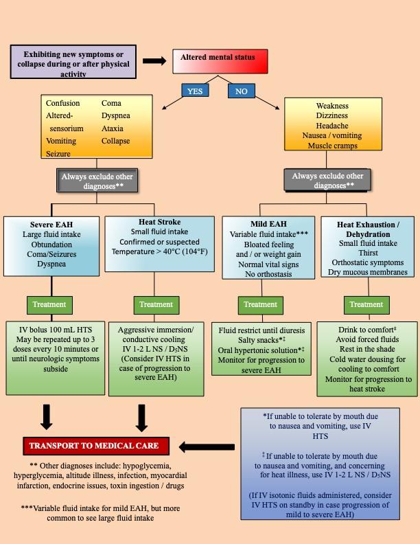 Appropriated management of EAH depends first on correctly diagnosing the condition. The guidelines address the assessment of patients with overlapping or nonspecific signs that can make differential diagnosis challenging, for example, with heat exhaustion or exertional heat stroke.