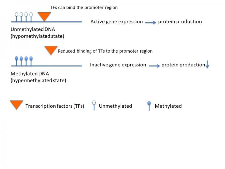 image: Low levels of DNA methylation (hypomethylated state) at promoter regions allow the binding of transcription factors (TFs), which leads to gene activation and subsequently protein production. Elevated DNA methylation (hypermethylation) at promoter regions inhibits the binding of transcription factors (TFs) resulting in decreased gene activation and therefore reduced protein production
