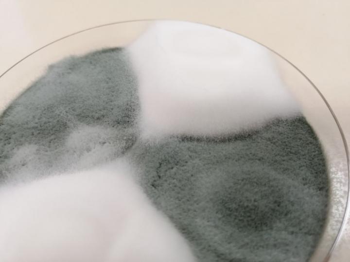image: Cultures of Penicillium camemberti (white and fluffy) and Penicillium biforme (grey-green) in a Petri dish