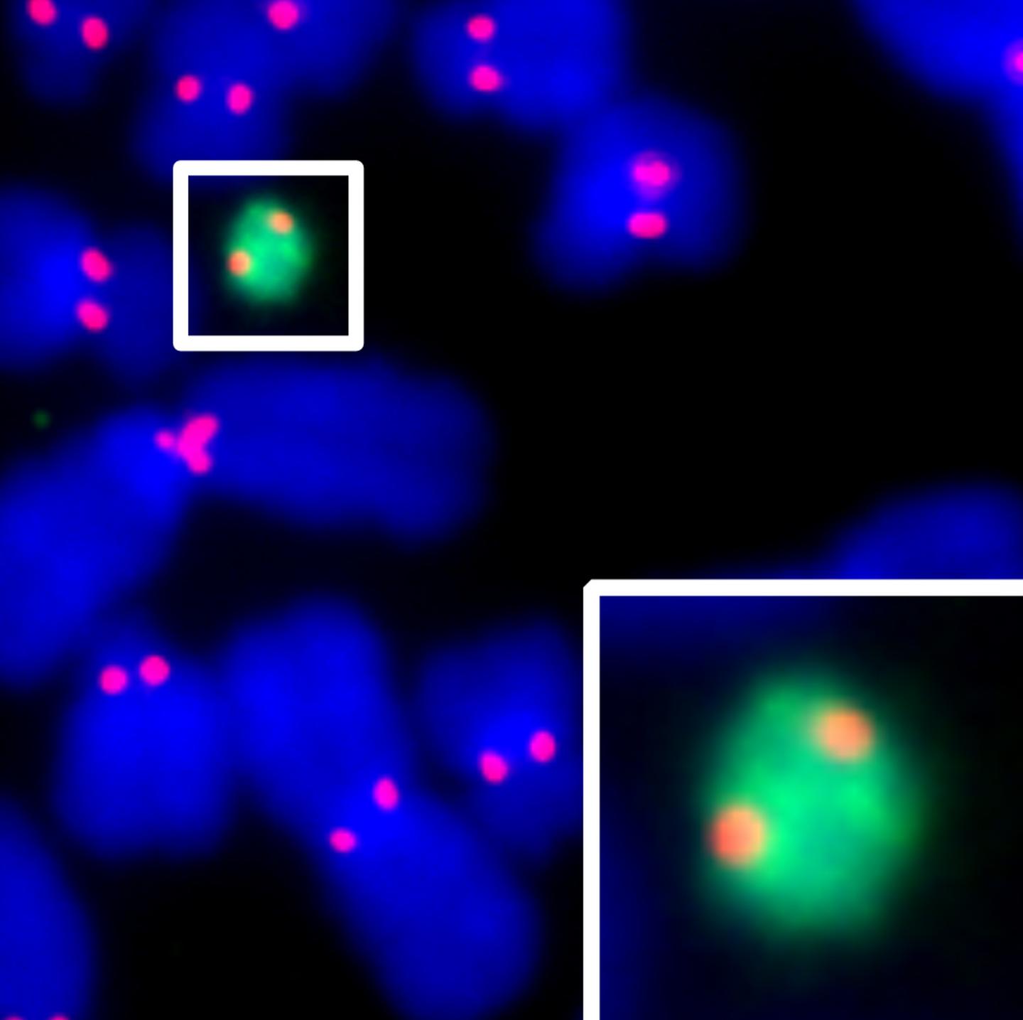 image: Human artificial chromosome (HAC, green) with two sister centromeres (red), similar to that of the natural host chromosomes (blue).