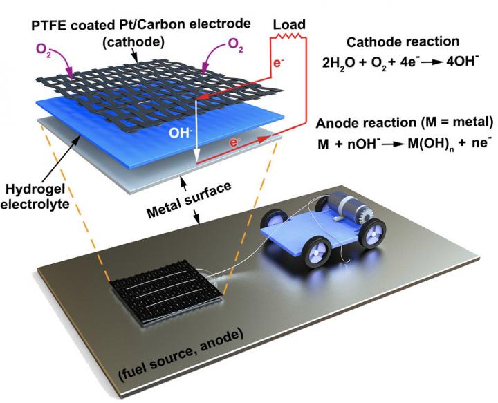Like a traditional battery, the researchers' MAS starts with a cathode that's wired to the device it's powering. Underneath the cathode is a slab of hydrogel, a spongy network of polymer chains that conducts electrons between the metal surface and the cathode via the water molecules it carries. With the hydrogel acting as an electrolyte, any metal surface it touches functions as the anode of a battery, allowing electrons to flow to the cathode and power the connected device.