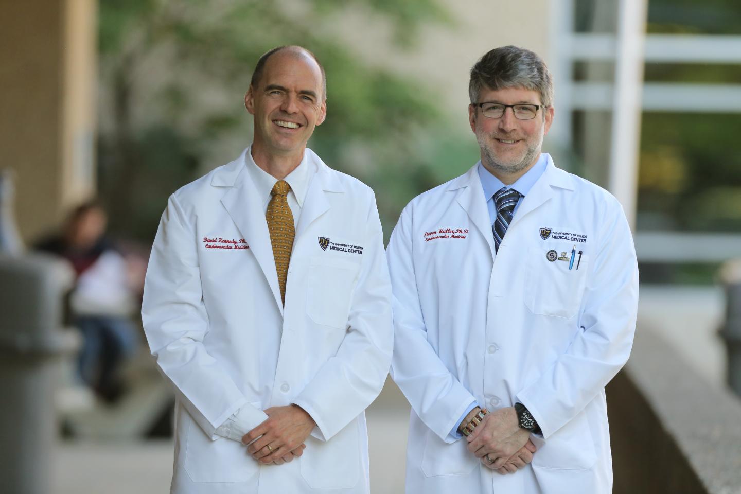 image: Dr. David Kennedy (left) and Dr. Steven Haller recently published research that found microcystin, a toxin produced by blue-green algae, may be more dangerous than previously known for those with preexisting liver disease. Kennedy and Haller are assistant professors of medicine at The University of Toledo.