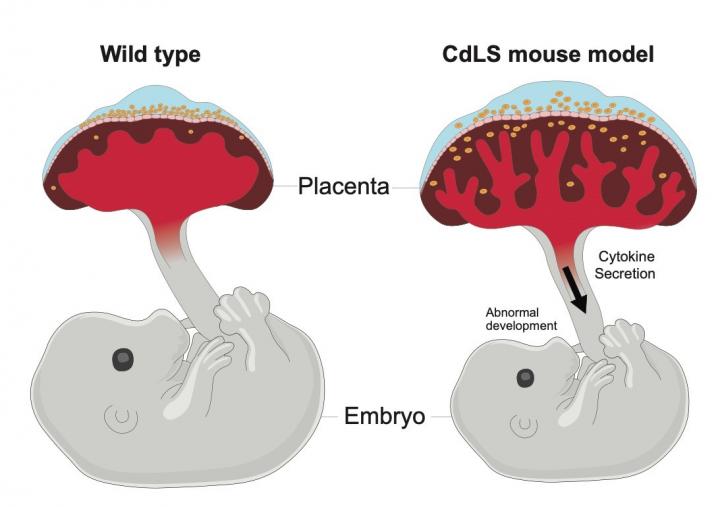 image: The placenta is essential for embryo development and acts as an interface between the embryo and mother for the exchange of gas, nutrient, and waste products. Mutations that affect cohesin genes cause the human developmental disorder Cornelia de Lange syndrome (CdLS). Mouse models of CdLS show placental abnormalities such as increased placental size and activated cytokine signaling, which leads to embryo growth retardation.